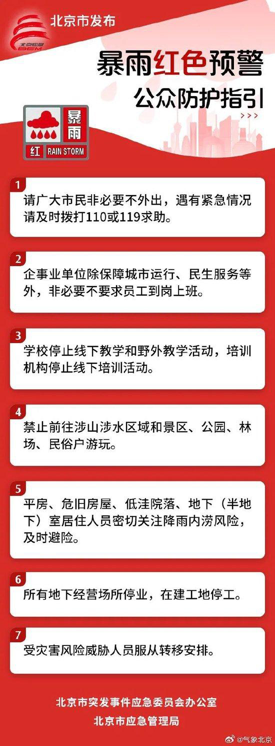 北京市防汛辦提示:防汛一級應(yīng)急響應(yīng)區(qū)域市民非必要不外出,確需出行人員關(guān)注出行提醒,遇有積水路段請勿涉水行車,不要在低洼路段和區(qū)域停放車輛。企事業(yè)單位除保障城市運(yùn)行、民生服務(wù)等外,非必要不要求員工到崗上班。停止有組織的文旅活動和文化藝術(shù)培訓(xùn)、室內(nèi)外體育賽事活動及體育運(yùn)動類培訓(xùn)活動,并做好人員的安全疏散工作。學(xué)校停止全部線下教學(xué)活動和野外教學(xué)活動,培訓(xùn)機(jī)構(gòu)停止全部線下培訓(xùn)活動,妥善安置、安全轉(zhuǎn)移相應(yīng)滯留人員。在建工地停工,及時轉(zhuǎn)移、妥善安置相關(guān)工地人員。停止涉山涉水戶外旅游,關(guān)閉所有景區(qū)、公園、林場,民宿和民俗戶停業(yè),游客疏導(dǎo)勸返,并做好受威脅游客疏散避險。