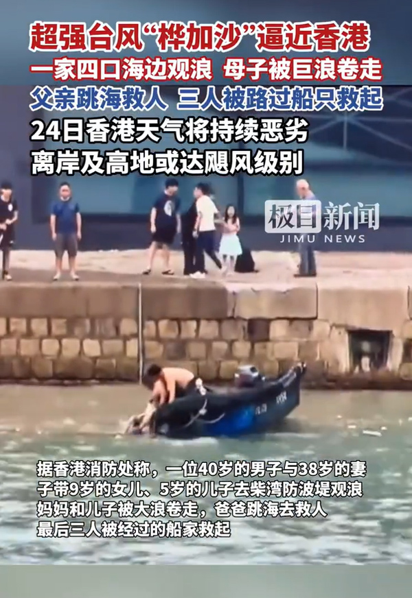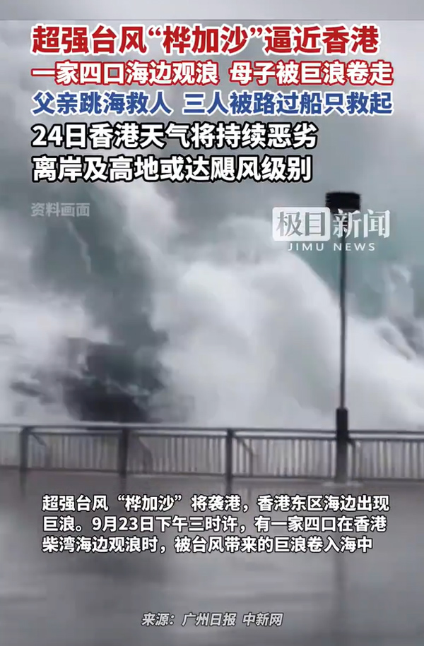 超強(qiáng)臺(tái)風(fēng)“樺加沙”來襲,香港海邊驚現(xiàn)險(xiǎn)情。一家四口海邊觀浪,母子被巨浪卷走,被巨浪卷走,父親跳海救人。幸運(yùn)的是,三人被路過船只及時(shí)救起。