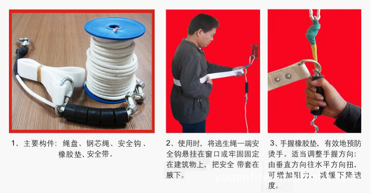 二、材質(zhì)性能: 逃生繩內(nèi)芯采用軍用航空鋼絲,外包由尼龍線編織而成,下降時(shí)中途遇到火情不易燒斷,依然可以自行緩慢下降,保證了逃生安全。