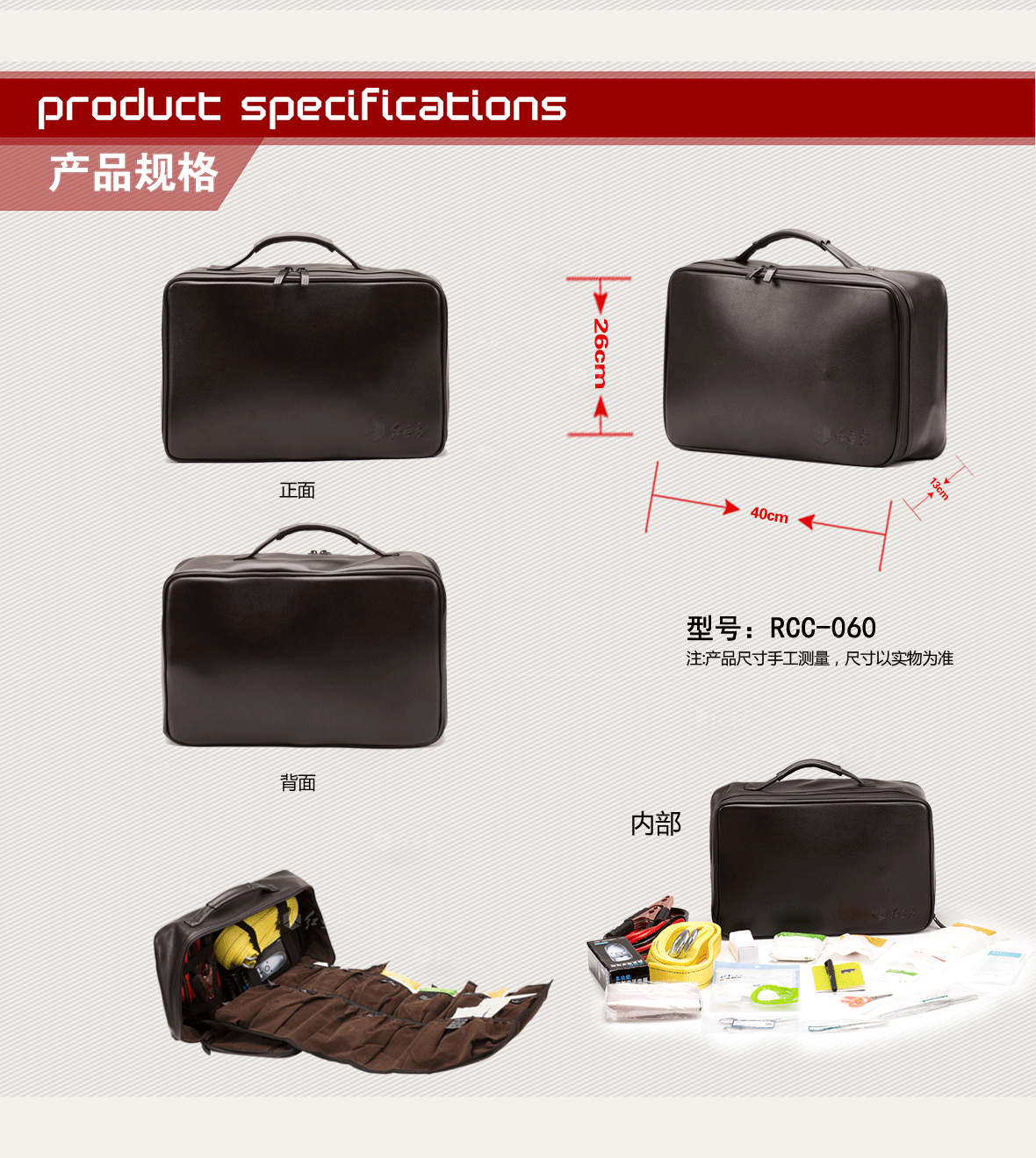 | 型號:RCF-060皮質應急包 | 外包材質: 仿皮 | 顏色:黑色 | ||||||